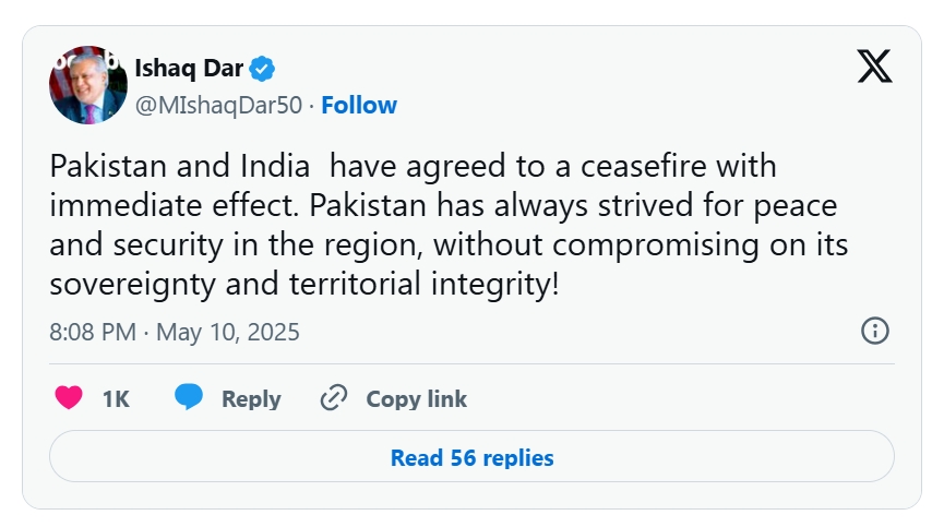 當地時間10日,巴基斯坦副總理兼外長達爾通過社交媒體“X”發佈消息稱,巴基斯坦和印度已達成立即生效的停火協議。
