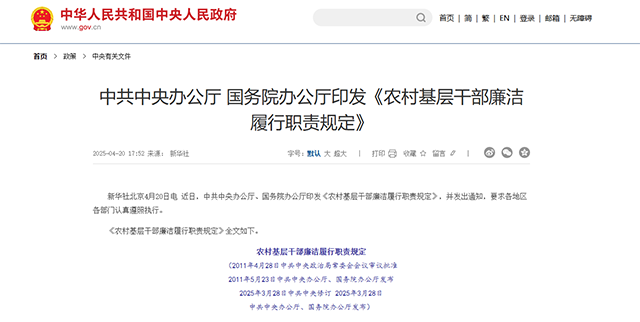 4月末,中共中央辦公廳、國務院辦公廳印發了新修訂的《農村基層幹部廉潔履行職責規定》(以下簡稱《規定》)。該規定的試行版於2011年頒佈施行,中央紀委國家監委法規室負責人指出,隨着全面從嚴治黨形勢任務和農村基層幹部隊伍狀況的發展變化,黨中央決定對《規定》進行修改完善。