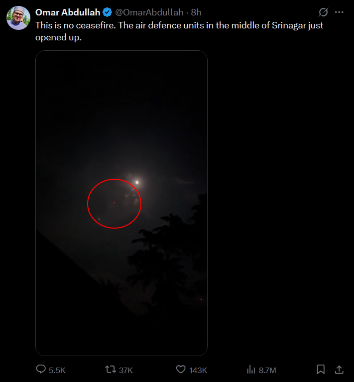 印度媒體10日也報道稱,在協議簽署後,印控克什米爾地區的斯利那加和查謨居民仍聽到了爆炸聲,兩地隨後採取停電措施。地區官員奧馬爾·阿卜杜勒(Omar Abdullah)在社交媒體發文稱,斯利那加市中心的防空系統進入作戰狀態。目前尚無人員傷亡報告。