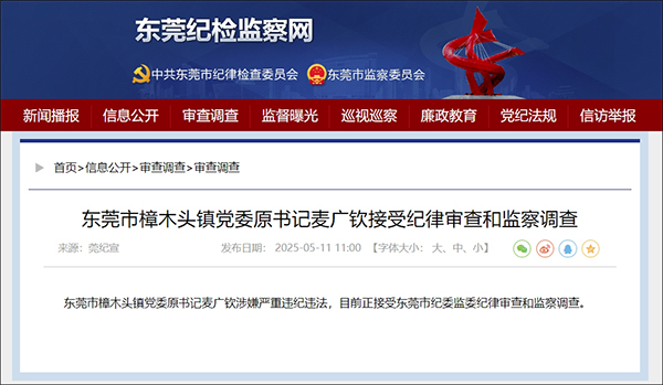 據廣東省東莞紀檢監察網5月11日消息,東莞市樟木頭鎮黨委原書記麥廣欽涉嫌嚴重違紀違法,目前正接受東莞市紀委監委紀律審查和監察調查。