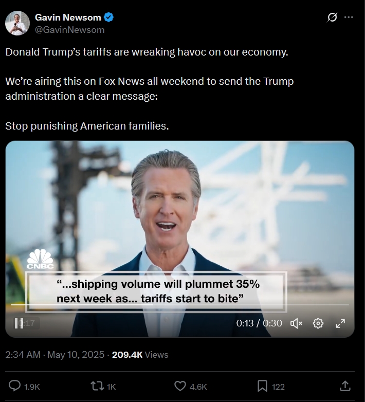 紐森10日在社交媒體X上宣佈了該消息。據他稱,該廣告將在接下來的“整個週末”在福克斯新聞台播出,目的是向特朗普政府發出一條“明確的信息”——“停止懲罰美國家庭”。他表示,關税政策正在對美國經濟造成“嚴重破壞”。