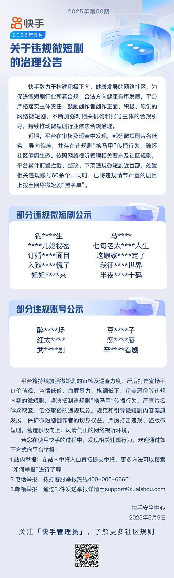 5月9日,微信公眾號“快手黑板報”發佈《關於違規微短劇的治理公告(2025年5月)》稱,近期,快手平台在審核及巡查中發現,部分微短劇片名低劣、導向偏差,並存在違規劇“換馬甲”傳播行為,破壞社區健康生態。依照網絡視聽管理相關要求及社區規則,快手平台累計前置攔截、整改、下架違規微短劇近百部,處置相關違規賬號60餘個;同時,已將違規情節嚴重的劇目上報至網絡微短劇“黑名單”。
