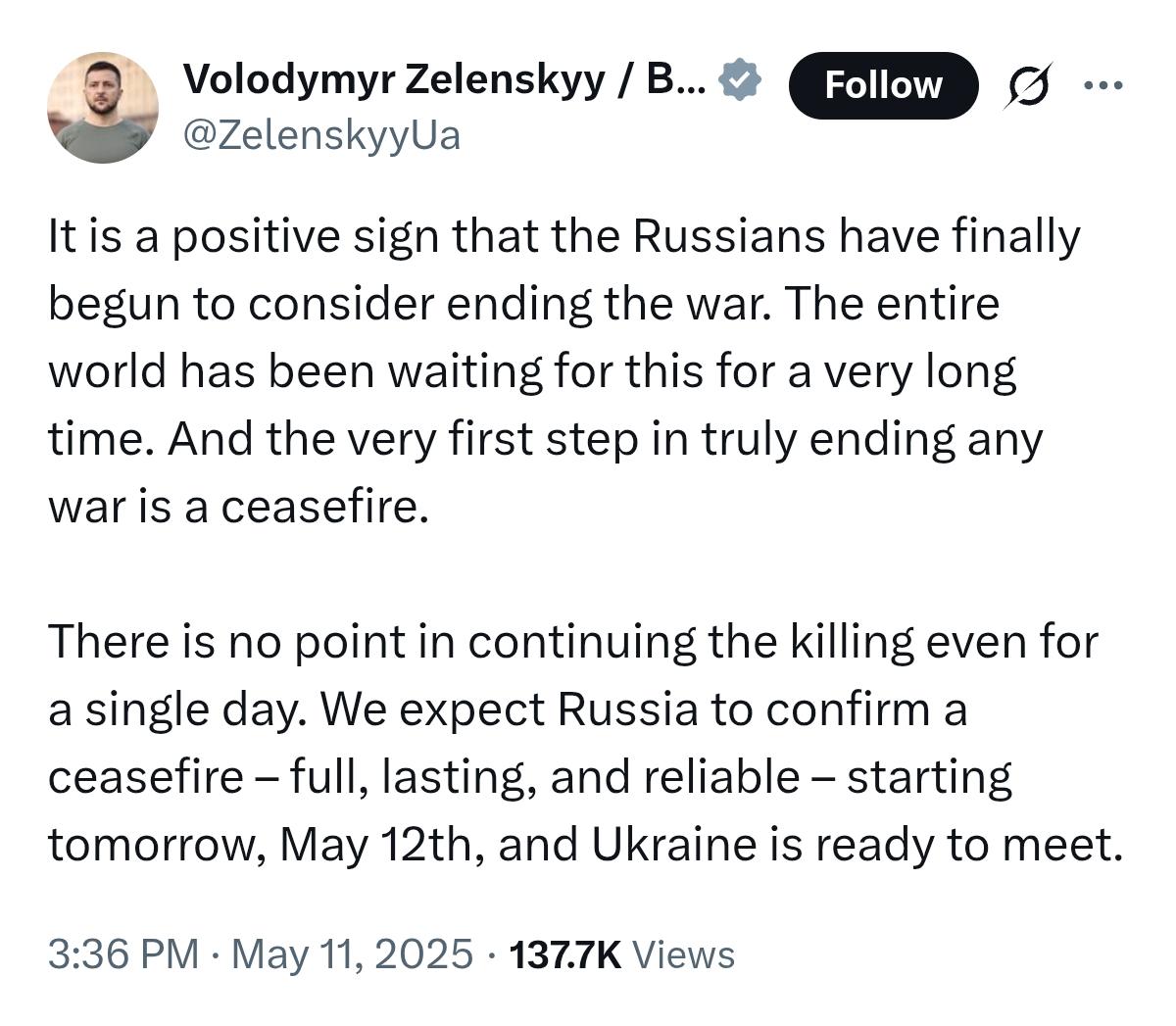 “真正地結束戰爭的第一步是停火”,澤連斯基寫道,“我們期待俄羅斯能夠實施全面、持久且可靠的停火,從明天——5月12日開始。烏克蘭已準備好進行會面。”