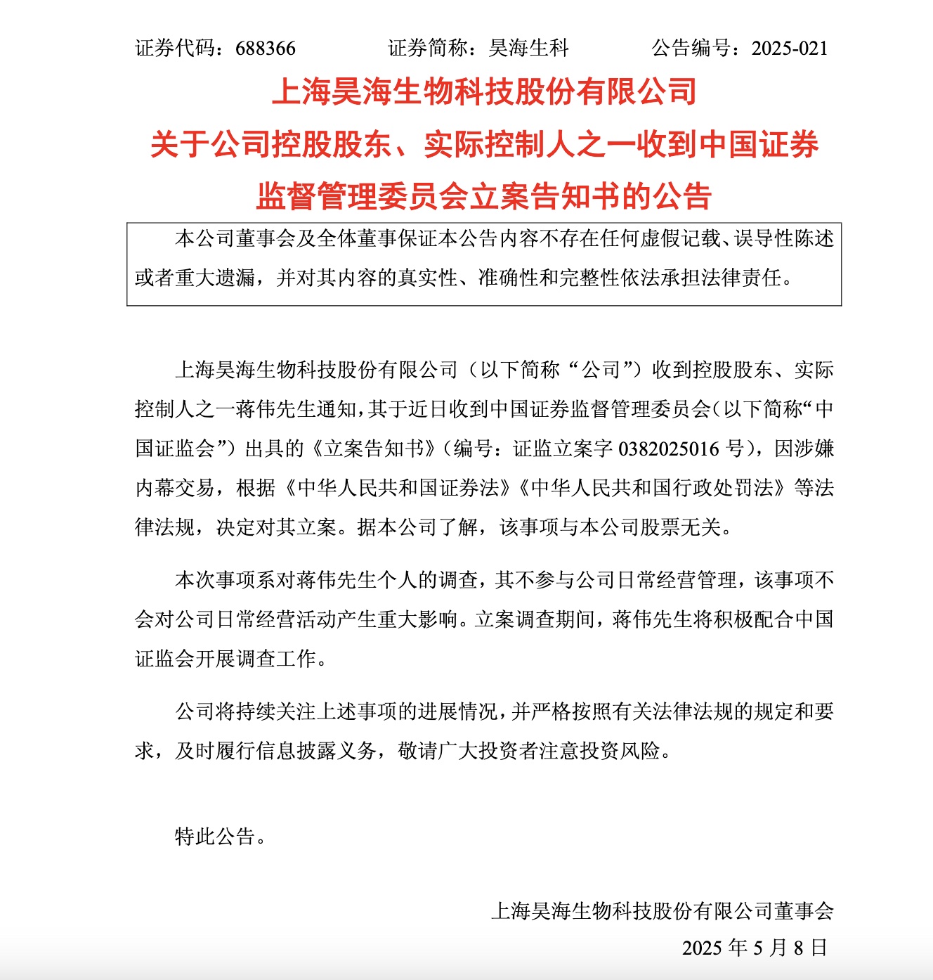 5 月 7 日晚間,昊海生科(688366.SH)發佈公告顯示,公司控股股東、實際控制人之一蔣偉,因涉嫌內幕交易,收到中國證監會出具的《立案告知書》,證監會決定對其立案調查 。