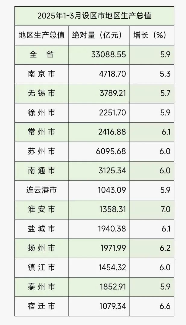 一季度是全年經濟的風向標。從江蘇各市數據來看,13個設區市地區生產總值均超過千億元,其中有4市超過2500億元,整體呈現向新向好的發展態勢。