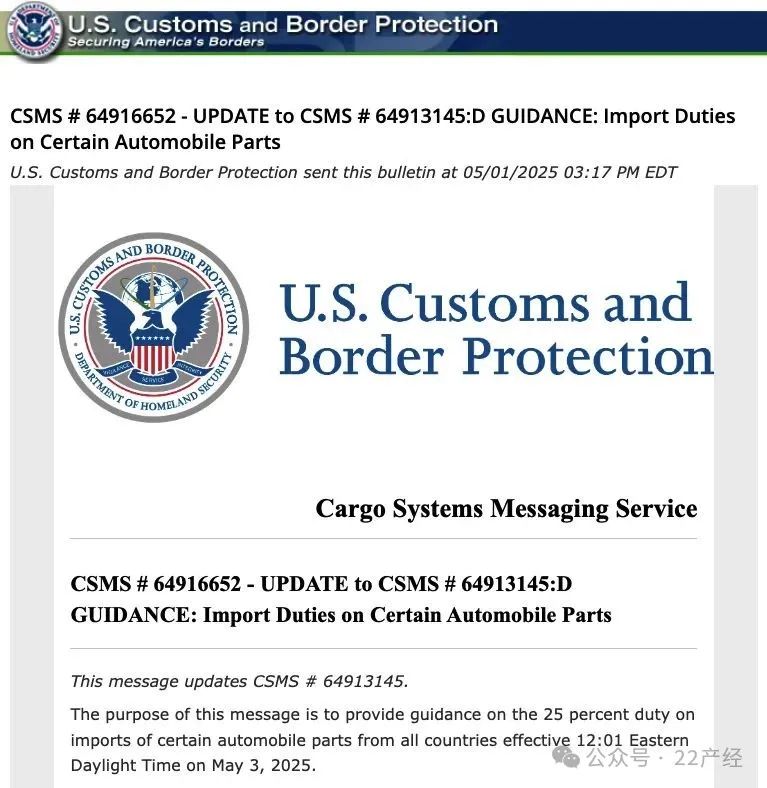 美國總統特朗普於2025年3月26日簽署第10908號公告,標誌着關税政策的正式啓動。公告中對整車和關鍵零部件的加徵內容做出明確:進口整車關税於2025年4月3日生效,而對發動機、變速箱、動力總成、電氣部件等核心汽車零部件加徵25%關税的規定則於5月3日正式實施。