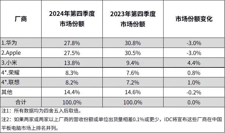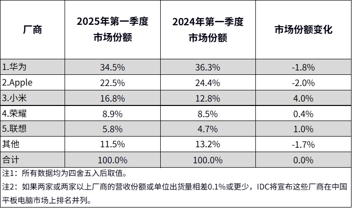 2025年第一季度中國平板電腦市場出貨量前五大廠商市場表現如下: