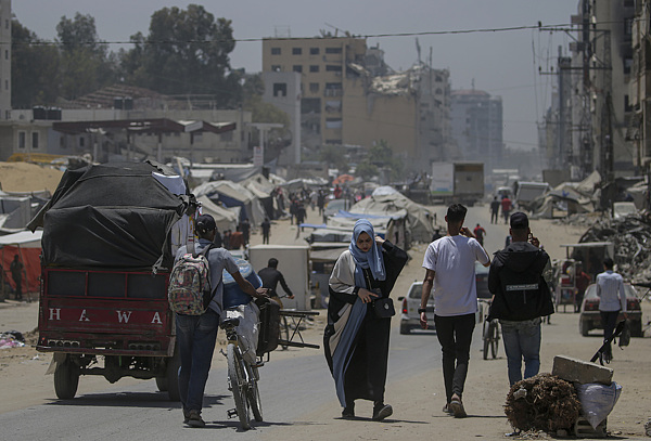 5月11日,來自加沙城東部和北加沙地帶的流亡巴勒斯坦人走在加沙市的街頭。 視覺中國