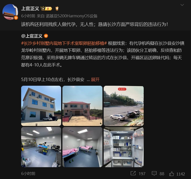 近日,知名“打拐志願者”上官正義接到知情人舉報稱,在湖南省長沙市下轄一村莊有非法代孕的手術室和實驗室,暗地開展地下代孕業務,非法進行取卵手術和受精卵培育等交易。