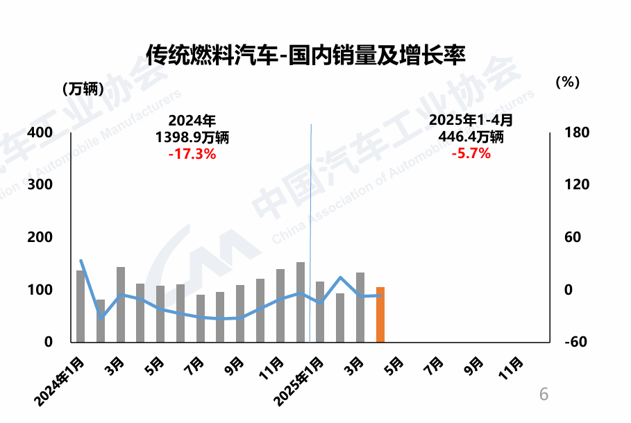 今年以來,國內燃油車銷量持續下滑,前四月,傳統燃料乘用車國內銷量359.2萬輛,比上年同期減少18萬輛,同比下降4.8%,同期國內新能源乘用車銷量為344萬輛,同比增長44.7%。