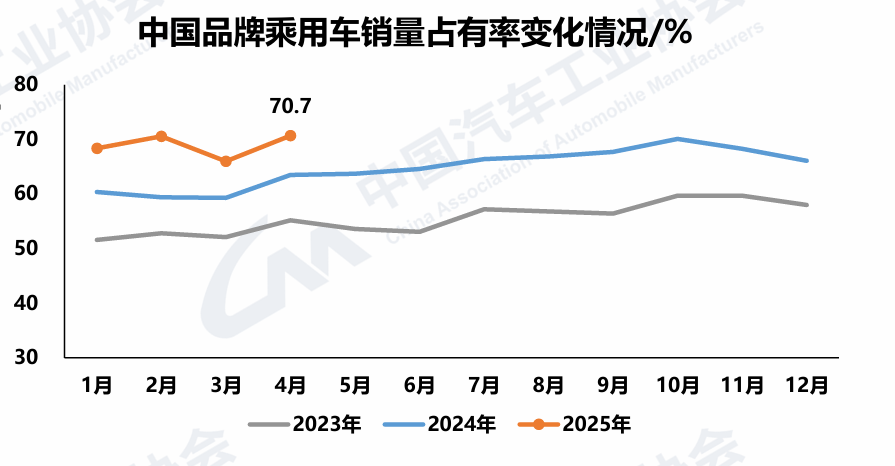 4月,中國品牌乘用車共銷售157.1萬輛,同比增長23.5%,佔乘用車銷售總量的70.7%,市佔率重回70%以上。
