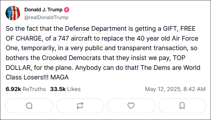 一個有意思的插曲是,當地時間5月11日晚,特朗普在其自創的社交平台Truth Social上證實,卡塔爾王室將向美國贈送一架波音747-8型客機,臨時作為美國總統專機“空軍一號”使用。