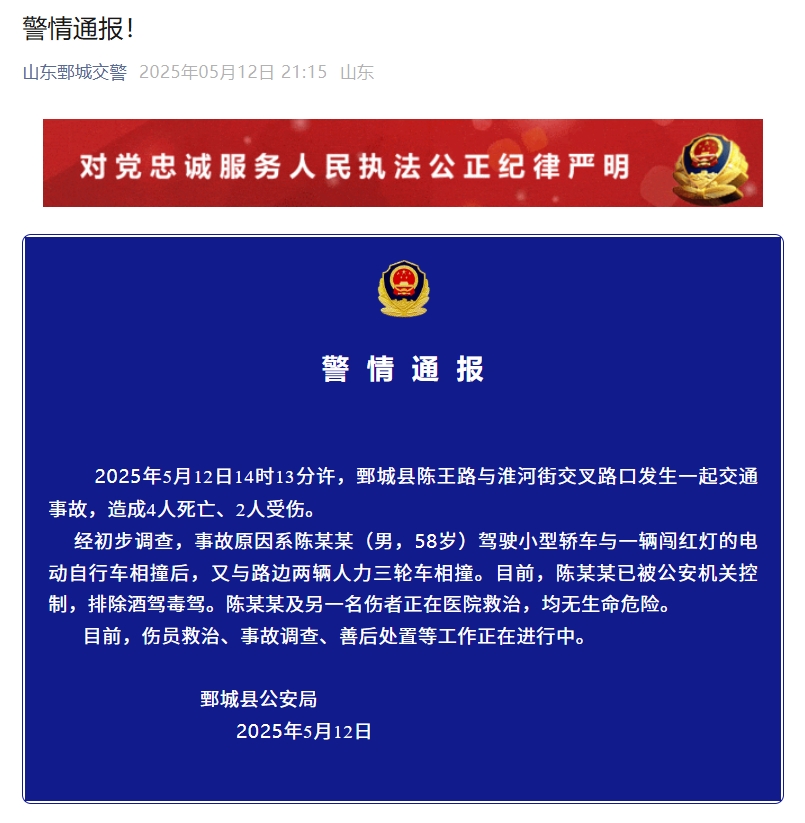 2025年5月12日14時13分許,鄄城縣陳王路與淮河街交叉路口發生一起交通事故,造成4人死亡、2人受傷。