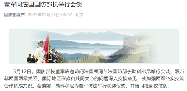 據微信公眾號“國防部發布”消息,5月12日,國防部長董軍應邀訪問法國期間與法國防部長勒科爾尼舉行會談。雙方就兩國兩軍關係、國際地區形勢和共同關心的問題深入交換意見,就加強兩軍務實交流合作達成共識。會談前,勒科爾尼為董軍訪法舉行歡迎儀式,並陪同檢閲儀仗隊。