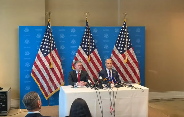 5月12日,美財長貝森特和貿易代表格里爾舉行媒體吹風會 視頻截圖