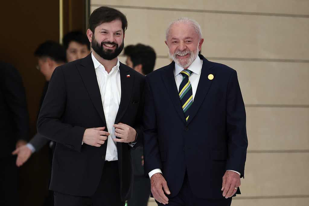 當地時間2025年5月13日,中國北京,巴西總統盧拉(右)與智利總統鮑裏奇在中國CELAC論壇部長會議開幕式前聊天,準備合影。視覺中國