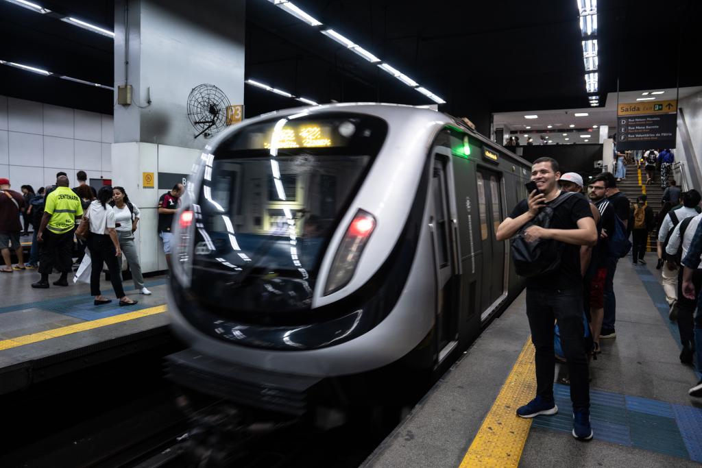 2024年11月13日,在巴西里約熱內盧博塔弗戈地鐵站,一輛由中車長春軌道客車股份有限公司製造的地鐵列車駛入站台。新華社