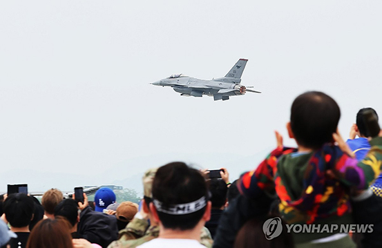 5月11日,在駐韓美國空軍烏山基地舉行的“烏山飛行表演秀”中,美國太平洋空軍F-16戰機進行特技飛行。韓聯社