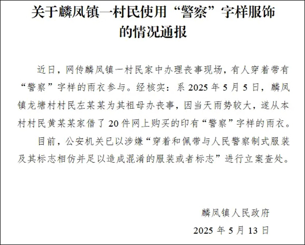 雲南威信縣麟鳳鎮人民政府微信公眾號“雪山勝境 最美麟鳳”5月13日發佈情況通報稱,近日,網傳麟鳳鎮一村民家中辦理喪事現場,有人穿着帶有“警察”字樣的雨衣參與。經核實:系2025年5月5日,麟鳳鎮龍塘村村民左某某為其祖母辦喪事,因當天雨勢較大,遂從本村村民黃某某家借了20件網上購買的印有“警察”字樣的雨衣。