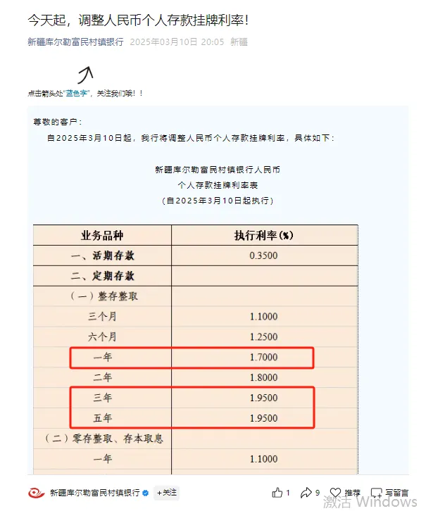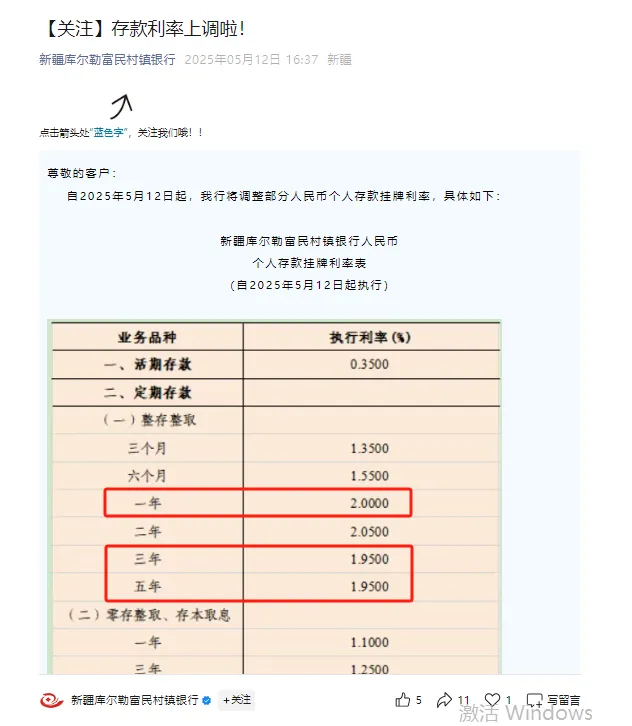 昨日,新疆庫爾勒富民村鎮銀行在官方微信公眾號發佈了存款利率調整的文章。