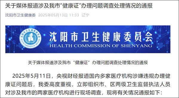 微信公眾號“瀋陽市衞生健康委”5月13日發佈《關於媒體報道涉及我市“健康證”辦理問題調查處理情況的通報》。