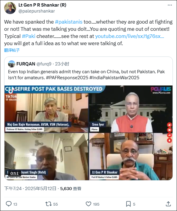 根據節目視頻顯示,印度陸軍退役中將尚卡爾(P.R Shankar)在當地時間5月11日的一檔網絡節目中竟認為,印度在這場衝突中所面對的,其實是比中國人還能更好操控中國武器裝備的巴基斯坦人。