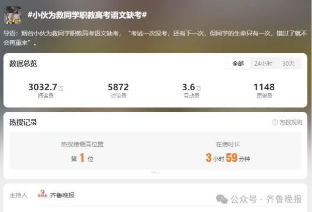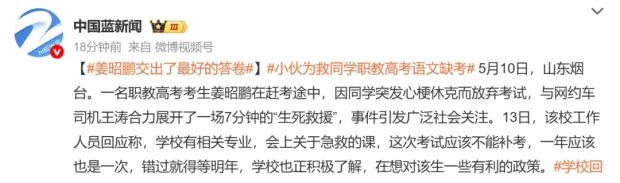 5月13日,“煙台小夥為救同學職教高考語文缺考”的視頻登上微博熱搜全國第一,引發網友關注。