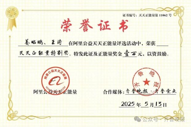為獎勵兩人的義舉,齊魯晚報·齊魯壹點聯合阿里公益天天正能量第一時間為姜昭鵬和王濤頒發榮譽獎狀,並頒贈萬元特別獎,致敬他們不做功利計算的大愛行動。