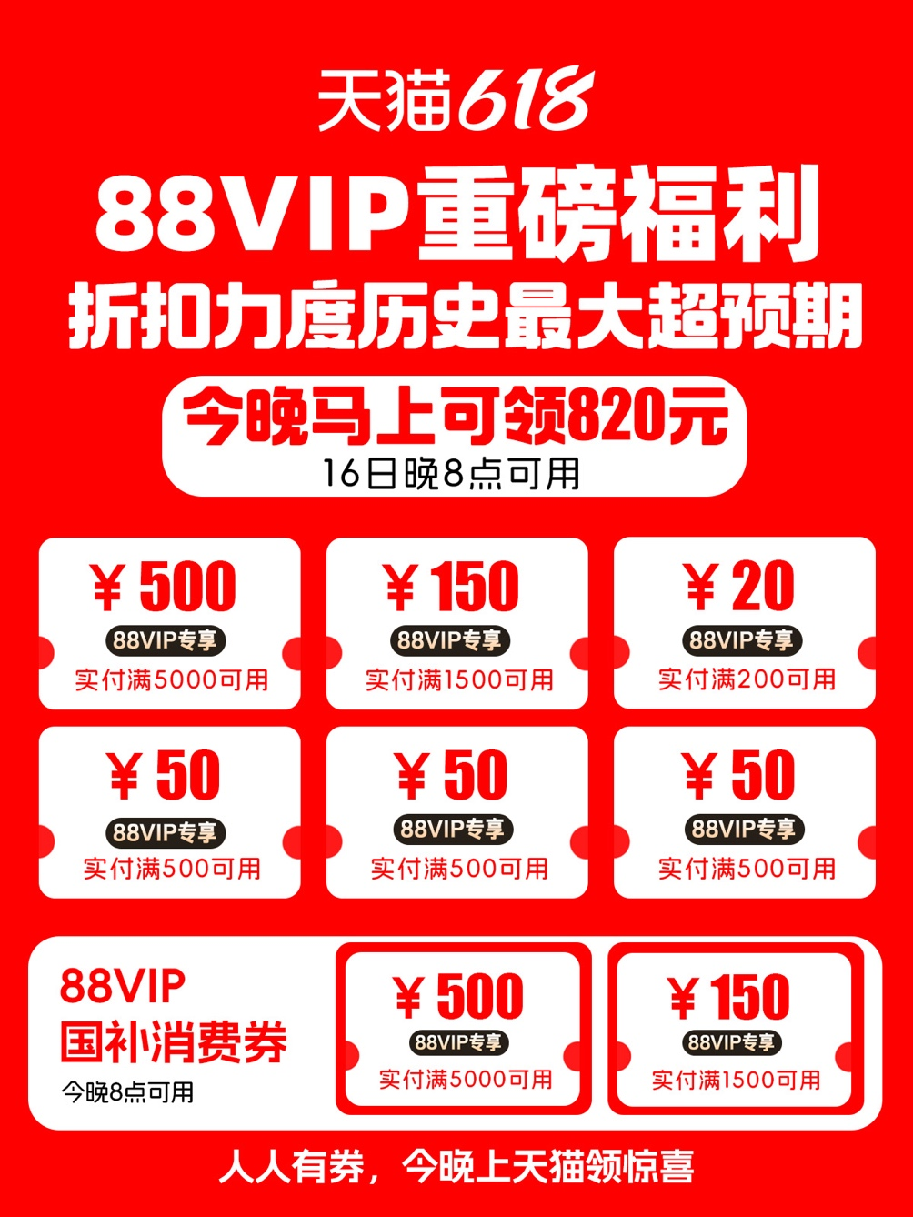超預期!88VIP今晚可領820元天貓618大額消費券!