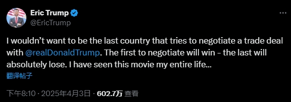 4月3日,特朗普次子埃裏克·特朗普在社交媒體X平台發文威脅稱:“我反正不想成為最後一個與特朗普談判貿易協議的國家。第一個談判的人會贏,最後一個談判的人肯定會輸。這種戲碼我這輩子都看得多了。”