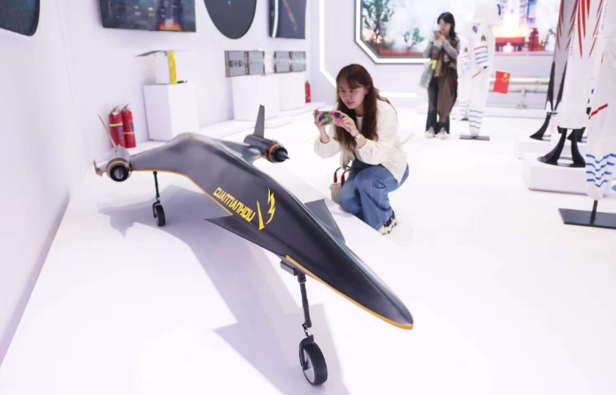 觀眾在拍攝“雲行”超音速飛機“竄天石猴”模型。2024年10月27 日,“雲行”系列超音速飛機驗證機試飛成功,在試飛過程中,飛機飛行速度超過4馬赫,升阻比達到3.5以上。