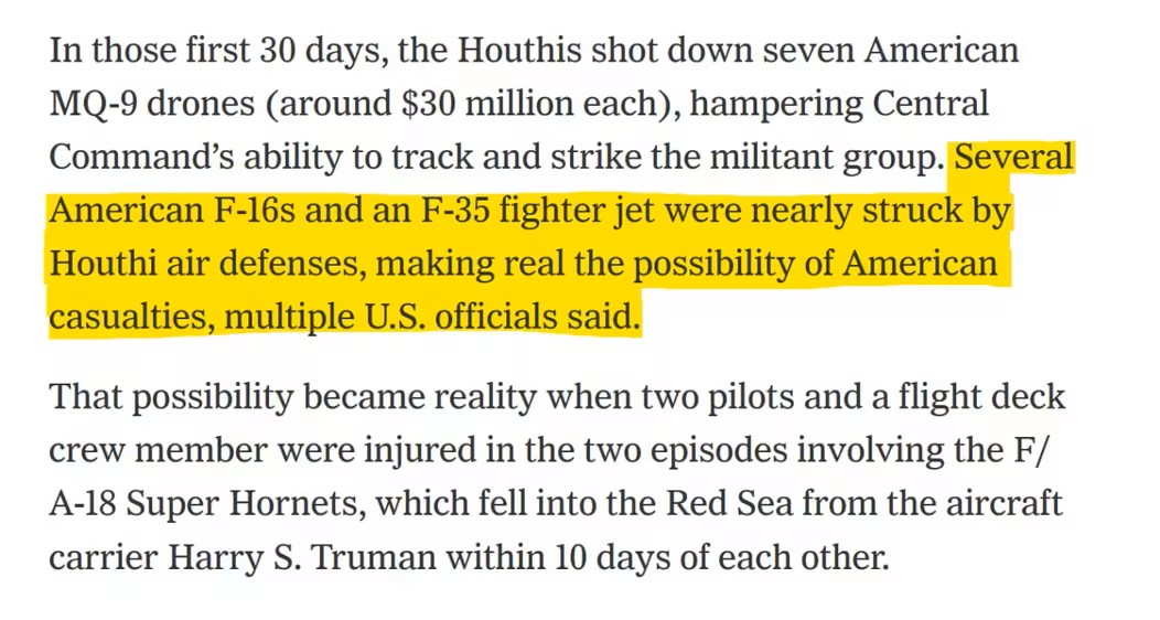 《紐約時報》爆料,多位美國官員表示數架F-16和一架F-35戰機險些被胡塞防空系統擊中