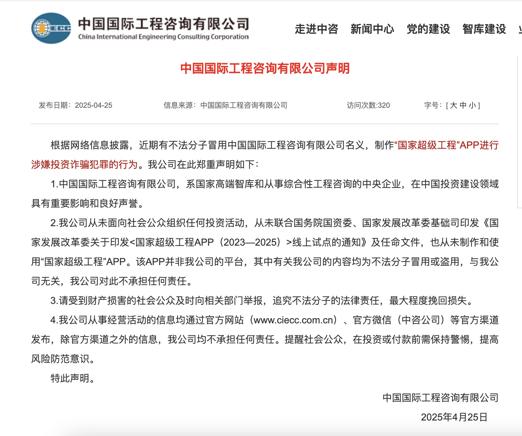 值得注意的是,該團伙還冒用中國國際工程諮詢有限公司的名義,謊稱該公司是“金磚國際工程”的發起方。然而,4月25日,中國國際工程諮詢有限公司已在官網發佈嚴正聲明,明確否認與該APP及所謂“金磚國際儲備幣”有任何關聯,並提醒公眾警惕詐騙。已誘導超過49萬次下載,大量中老年投資者將畢生積蓄投入這場精心設計的龐氏騙局。調查發現,該團伙不僅冒用"金磚國際項目部"名義開發非法應用程序,更偽造國家發改委文件。