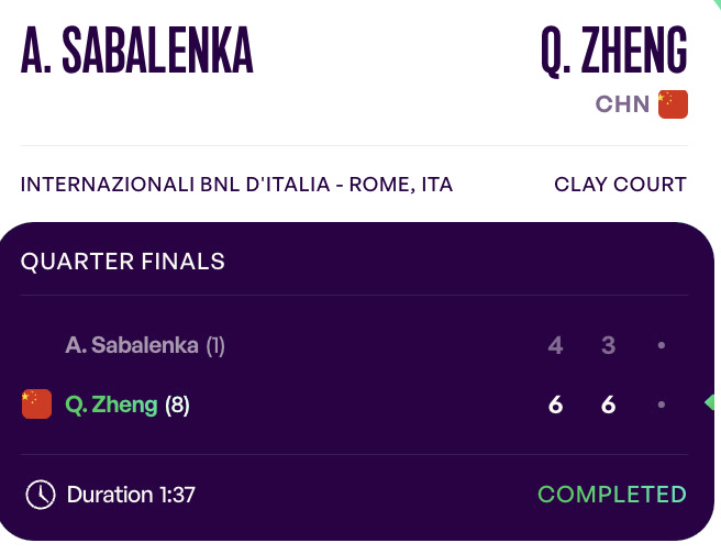 北京時間5月15日凌晨,在羅馬網球公開賽一場女單八強焦點戰中,鄭欽文面對世界第一薩巴倫卡,以6比4、6比3擊敗對手,成功翻越了這座“高山”。