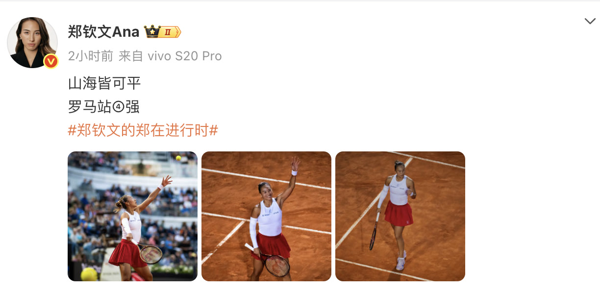 拿下比賽的鄭欽文臉上露出笑容,她擊敗這位此前從未戰勝過的對手,成功“翻山”。中國“金花”賽後也在社媒發文,“山海皆可平,羅馬站四強”。