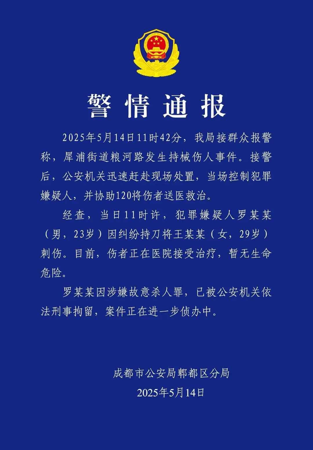 5月14日晚,成都市公安局郫都區分局發佈警情通報稱,2025年5月14日11時42分,警方接羣眾報警稱,犀浦街道糧河路發生持械傷人事件。接警後,公安機關迅速趕赴現場處置,當場控制犯罪嫌疑人,並協助120將傷者送醫救治。