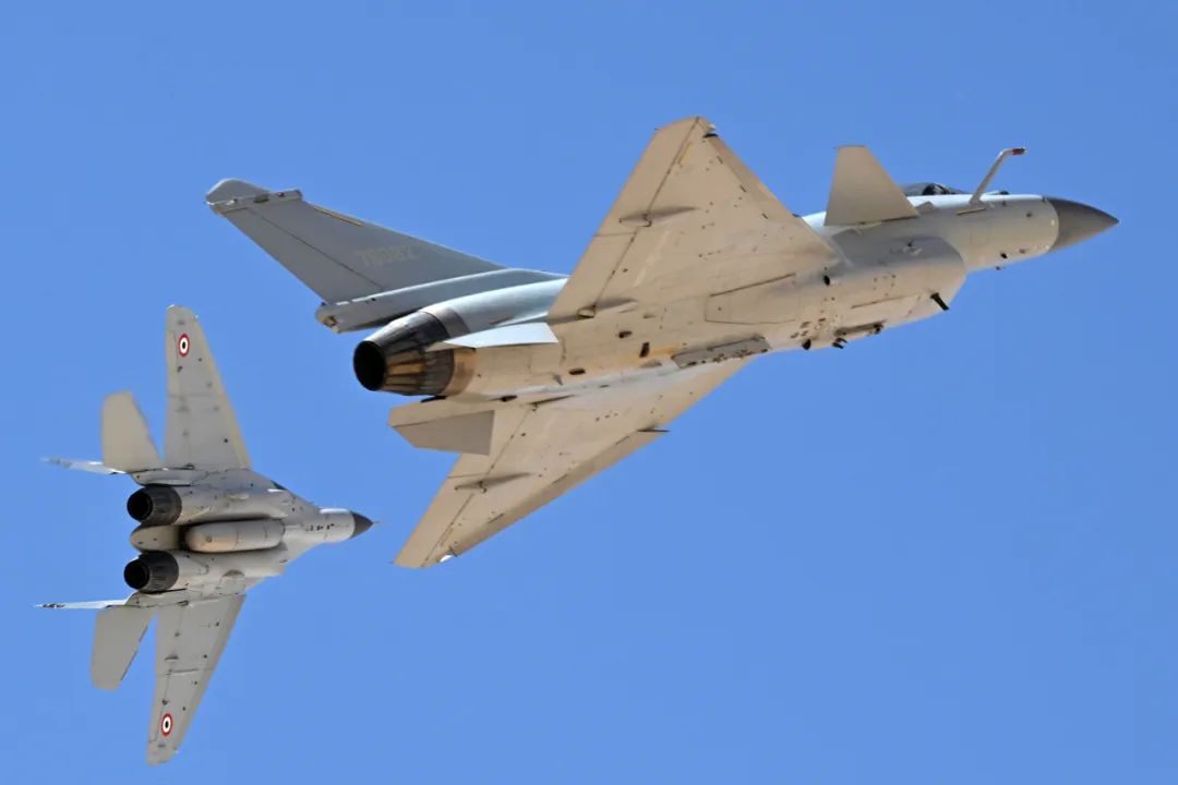 4月19日,埃及空軍某基地,參加中埃“文明之鷹-2025”空軍聯合訓練的中國空軍殲-10C戰機與米格-29戰機進行訓練。“中國軍號”微信公眾號