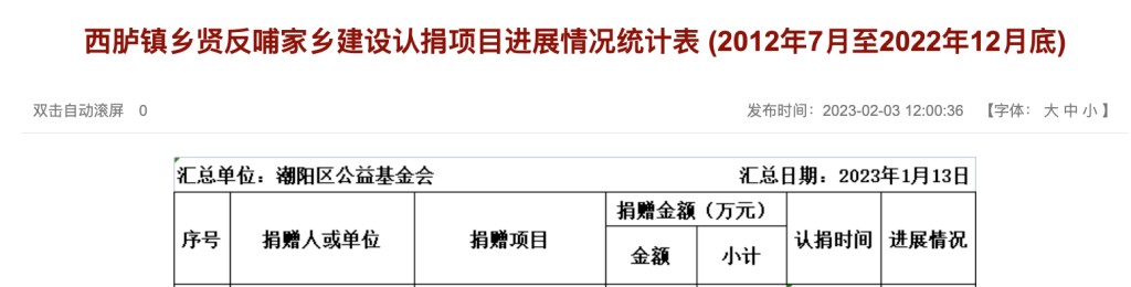 另據潮陽區公益基金會於2023年2月披露的西臚鎮鄉賢反哺家鄉建設認捐項目進展情況統計表,2012年7月-2022年12月底,陳英彪捐贈金額顯示為3012萬元,排名第9,其中對於西二幼兒園3000萬元的認捐時間分別為2014年和2015年,進展顯示為擬建。