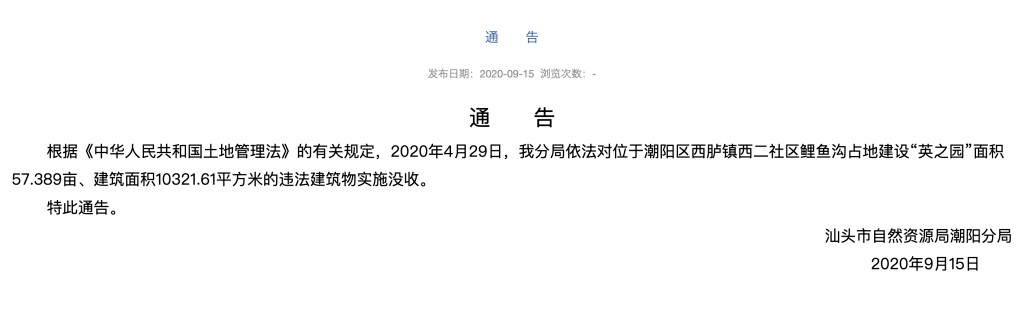 此外,在2020年9月15日,汕頭市自然資源局潮陽分局曾發佈公告表示,根據《土地管理法》的有關規定,2020年4月29日,該分局依法對位於潮陽區西臚鎮西二社區鯉魚溝佔地建設“英之園”面積57.389畝、建築面積10321.61平方米的違法建築物實施沒收。
