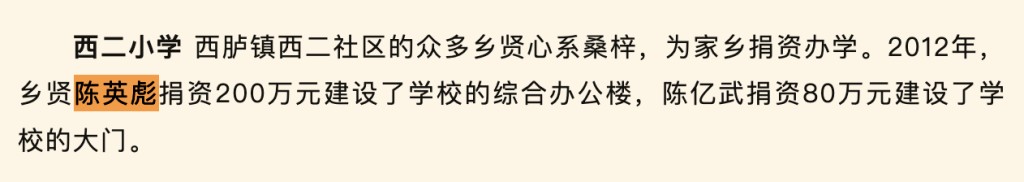 曾經,他是備受讚譽的鄉賢。澎湃新聞查閲到,微信公眾號“汕頭髮布”於2022年10月發佈的一篇《華僑與鄉賢|汕頭改革開放以來民間捐資辦學那些事兒·潮陽西臚篇》記錄,西臚鎮西二社區的眾多鄉賢心繫桑梓,為家鄉捐資辦學。2012年,鄉賢陳英彪捐資200萬元建設了西二小學的綜合辦公樓,陳億武捐資80萬元建設了學校的大門。