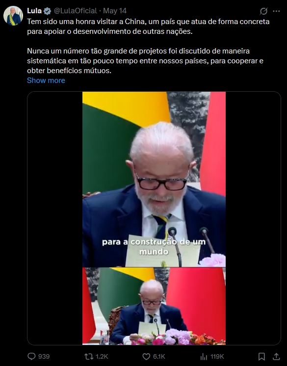 就在昨天(14日),巴西總統盧拉結束了為期五天的中國之行。這是盧拉第六次到訪中國,也是本屆任期內第二次來華訪問。期間,他參加了多場會議,集中會見了多名中國企業代表。有國內媒體統計,12日出席“中國—巴西商業研討會”當天,盧拉20小時內在社交媒體更新109條,分享他的行程收穫。