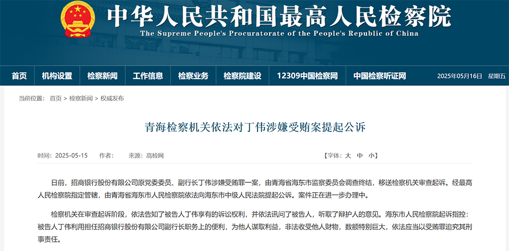 據高檢網5月15日消息,日前,招商銀行股份有限公司原黨委委員、副行長丁偉涉嫌受賄罪一案,由青海省海東市監察委員會調查終結,移送檢察機關審查起訴。經最高人民檢察院指定管轄,由青海省海東市人民檢察院依法向海東市中級人民法院提起公訴。案件正在進一步辦理中。