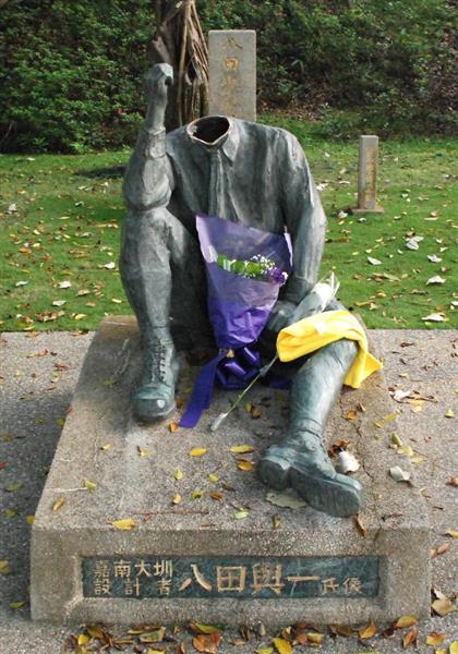 2017年,台南市烏山頭水庫邊,八田與一雕塑被“斬首”