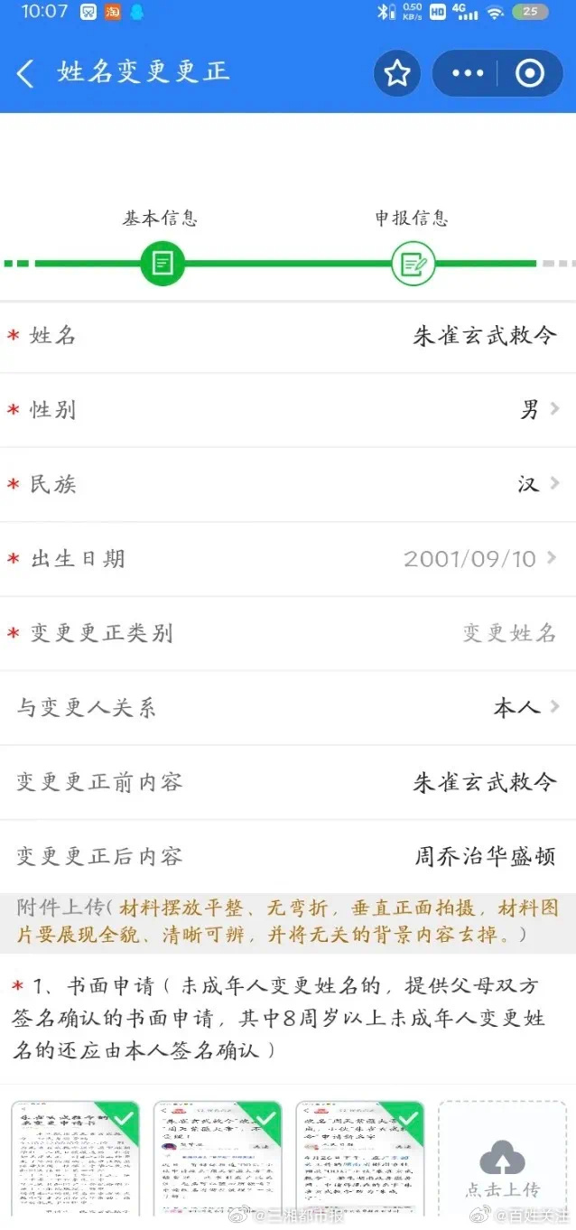 據@三湘都市報 報道,5月15日,“朱雀玄武敕令”發帖稱已經成功改名為“周喬治華盛頓”。