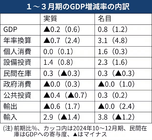 《日本經濟新聞》發佈的日本1季度GDP增減率的詳細情況,其中括號內是2024年第四季度的數據,▲代表負數。 《日本經濟新聞》