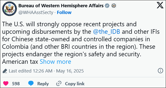 美國國務院西半球事務局在一份聲明中寫道,美國將強烈反對美洲開發銀行(IDB)和其他國際金融機構為中國在哥倫比亞(以及該地區其他“一帶一路”國家)的國企提供項目貸款。