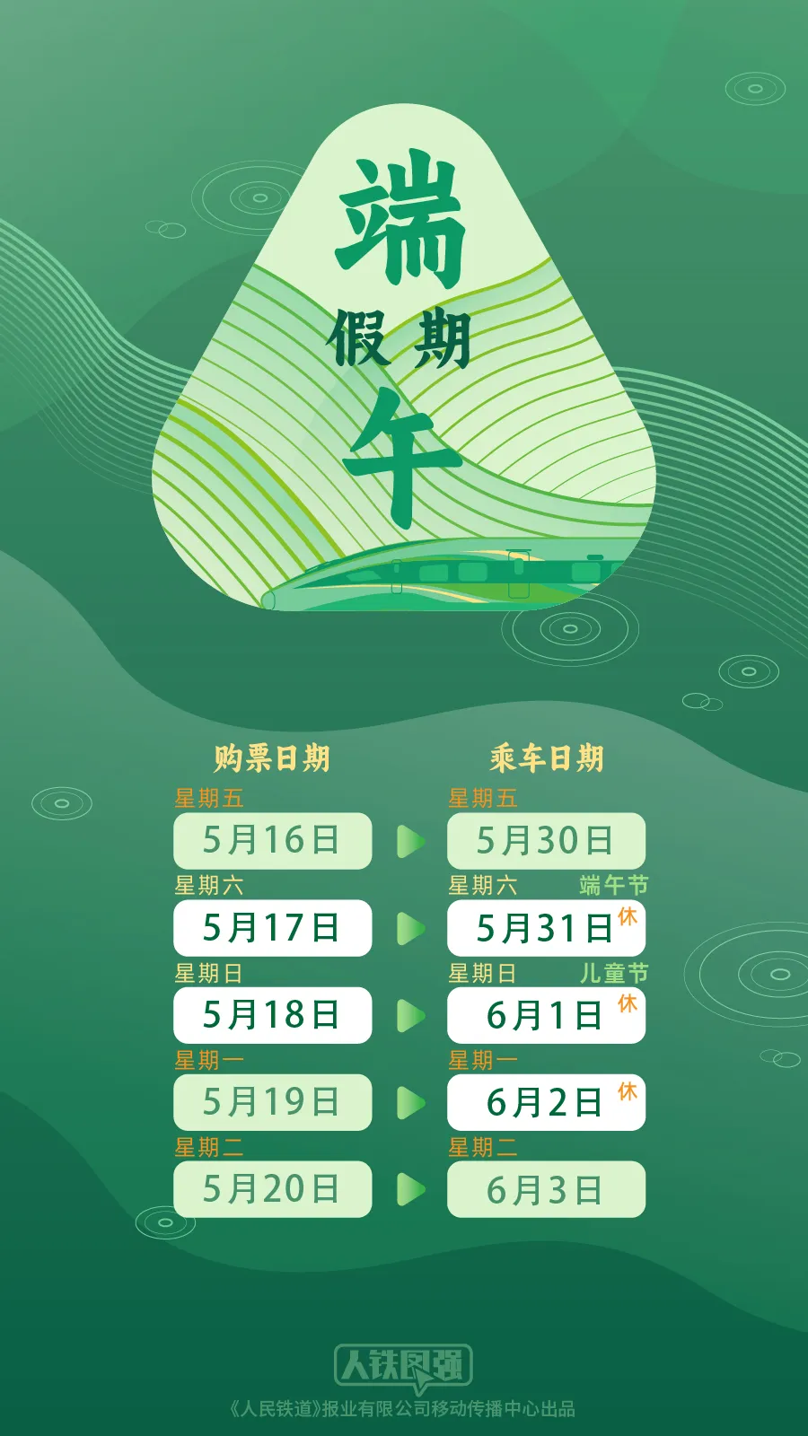 微信公眾號“中國鐵路”消息,鐵路端午假期運輸自5月30日至6月3日,為期5天,預計客流最高峯為5月31日,假期運輸首日火車票今日開始發售。