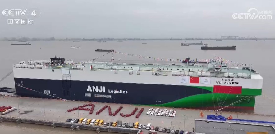 中國自主製造、9500車位的超大型汽車滾裝船“安吉安盛”輪開啓首航 央視新聞視頻截圖