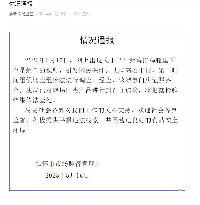 2025年5月16日,網上出現關於“正新雞排雞腿裏面全是蛆”的視頻,引發網民關注。我局高度重視,第一時間組織調查組依法進行調查。經查,該涉事門店證照齊全。我局已對現場同類產品進行封存並送檢,將根據檢驗結果依法查處。