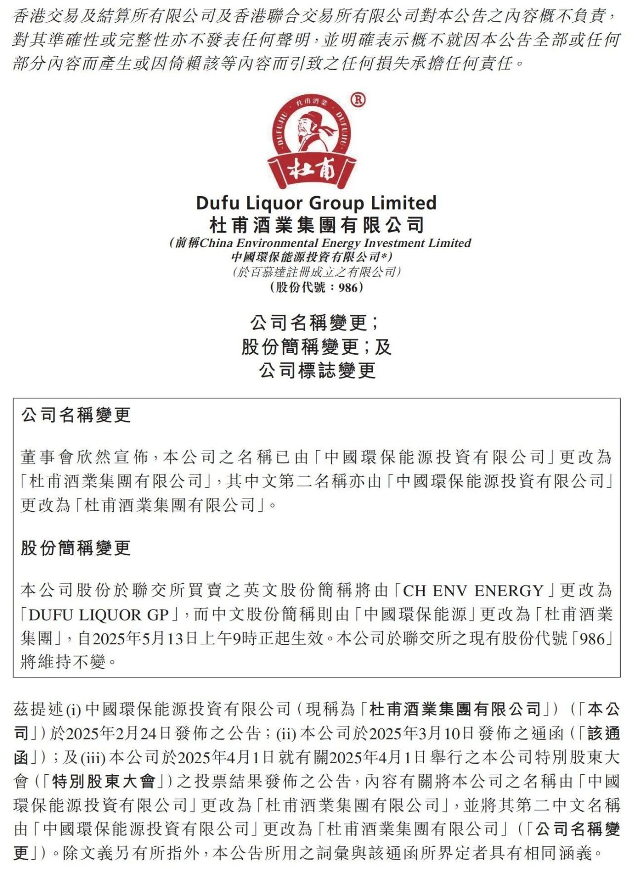 5月13日上午9時,與四川杜甫酒業簽署銷售代理協議近三個月後,港股上市公司中國環保能源(00986.HK)正式更名為“杜甫酒業集團有限公司”。其中文股份簡稱則由“中國環保能源”更改為“杜甫酒業集團”,公司於聯交所的現有股份代號“986”維持不變。